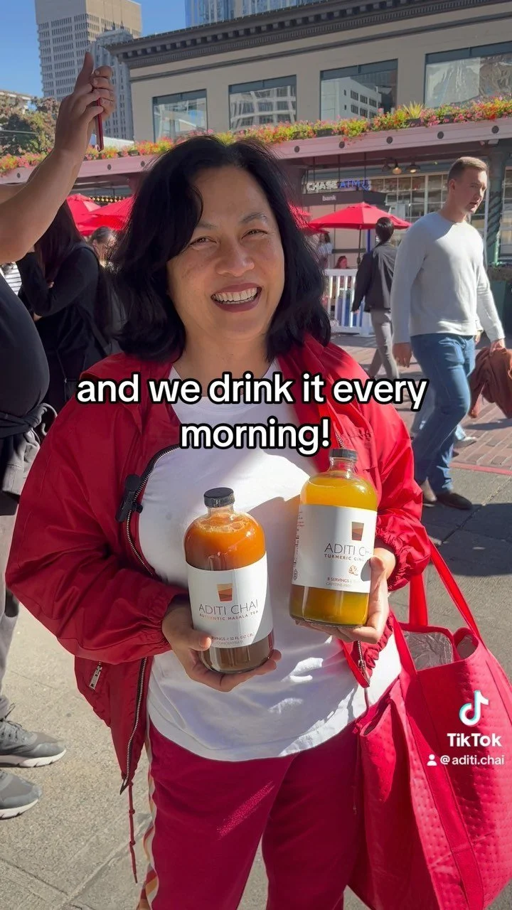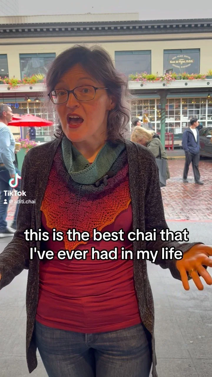 Pike Place Market's Aditi Chai is the original authentic Masala Chai company. Founded in 2018 using a hundred year-old multi-generational family recipe, we handcraft small batches of authentic Indian masala chai. Our chai uses carefully selected estate-grown Assamese black tea leaves, locally grown farm fresh organic lemongrass, ginger tubers, and fresh mint. We grind whole spices sourced from farmer-centric cooperatives. The result is an unmatched chai with multiple layers of flavors and experience. The tea is spice-filled, yet not spicy; sweetened though not sweet. We invite you to stop by when you are visiting Pike Place Market and "chai someβ!